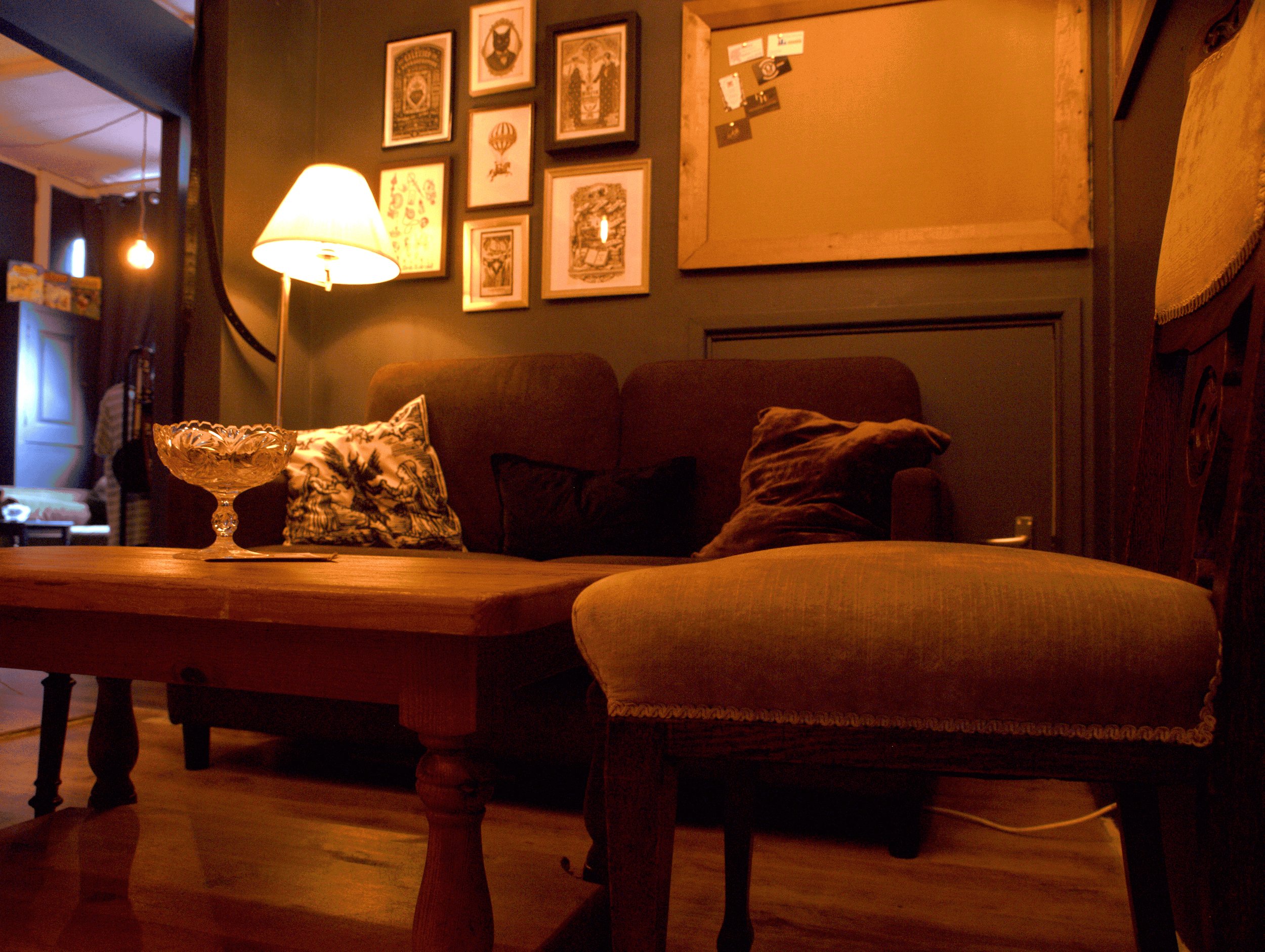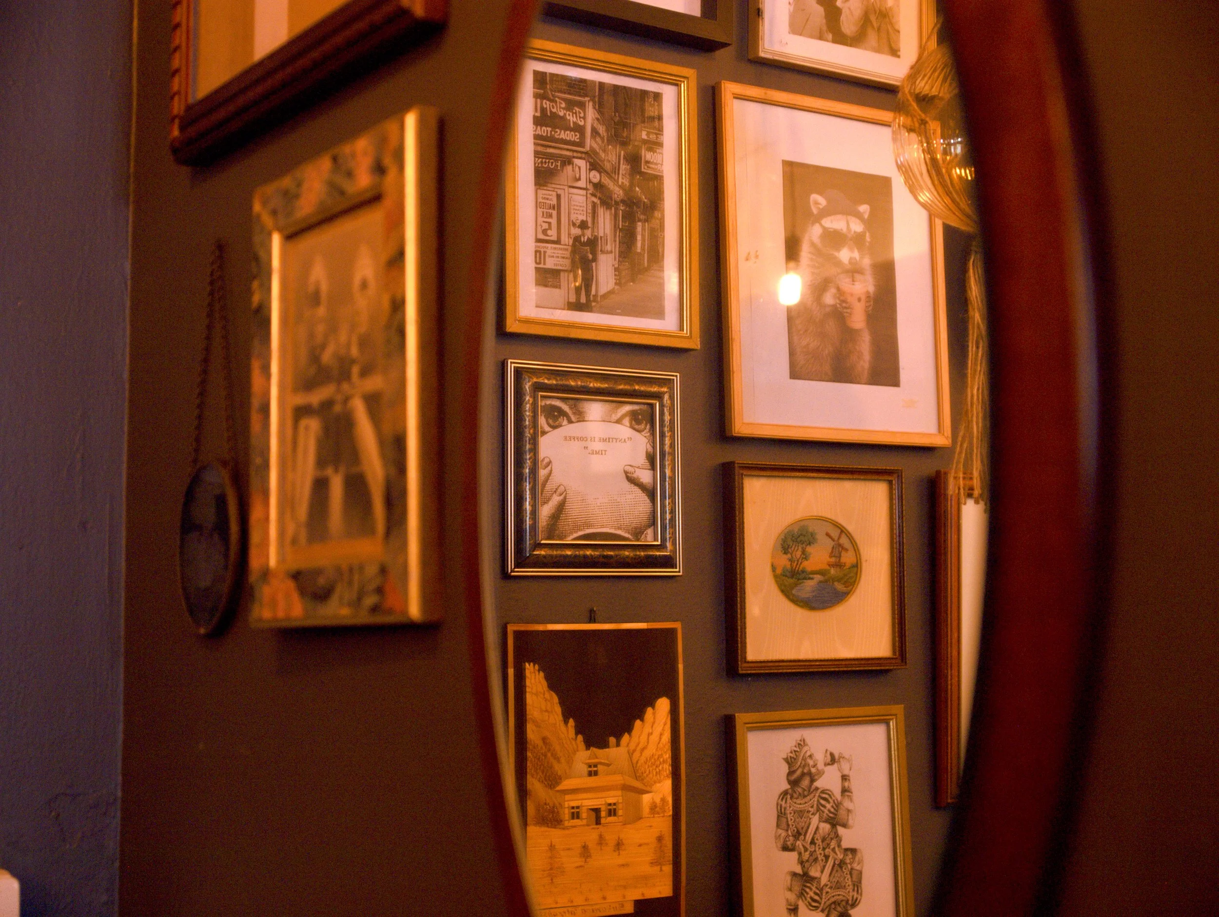 • A gallery wall with multiple framed artworks including a floral cross-stitch picture, a portrait of a woman with a headwrap, and various other paintings and photographs in gold and wooden frames.