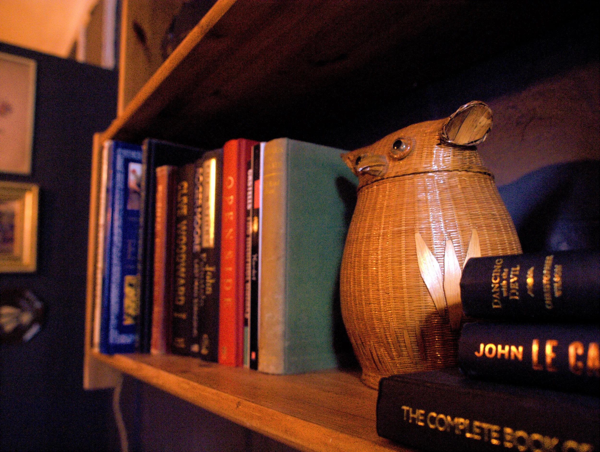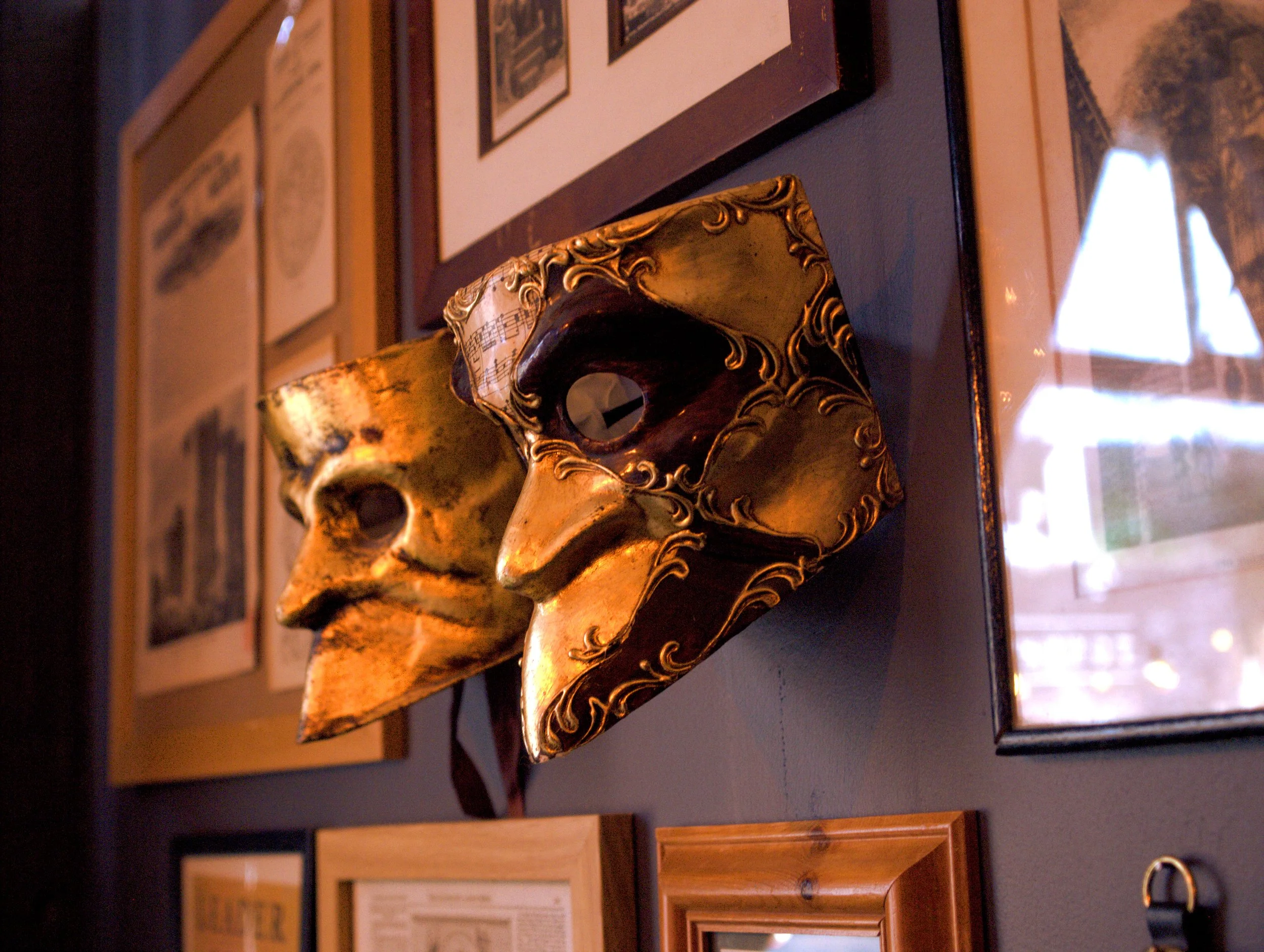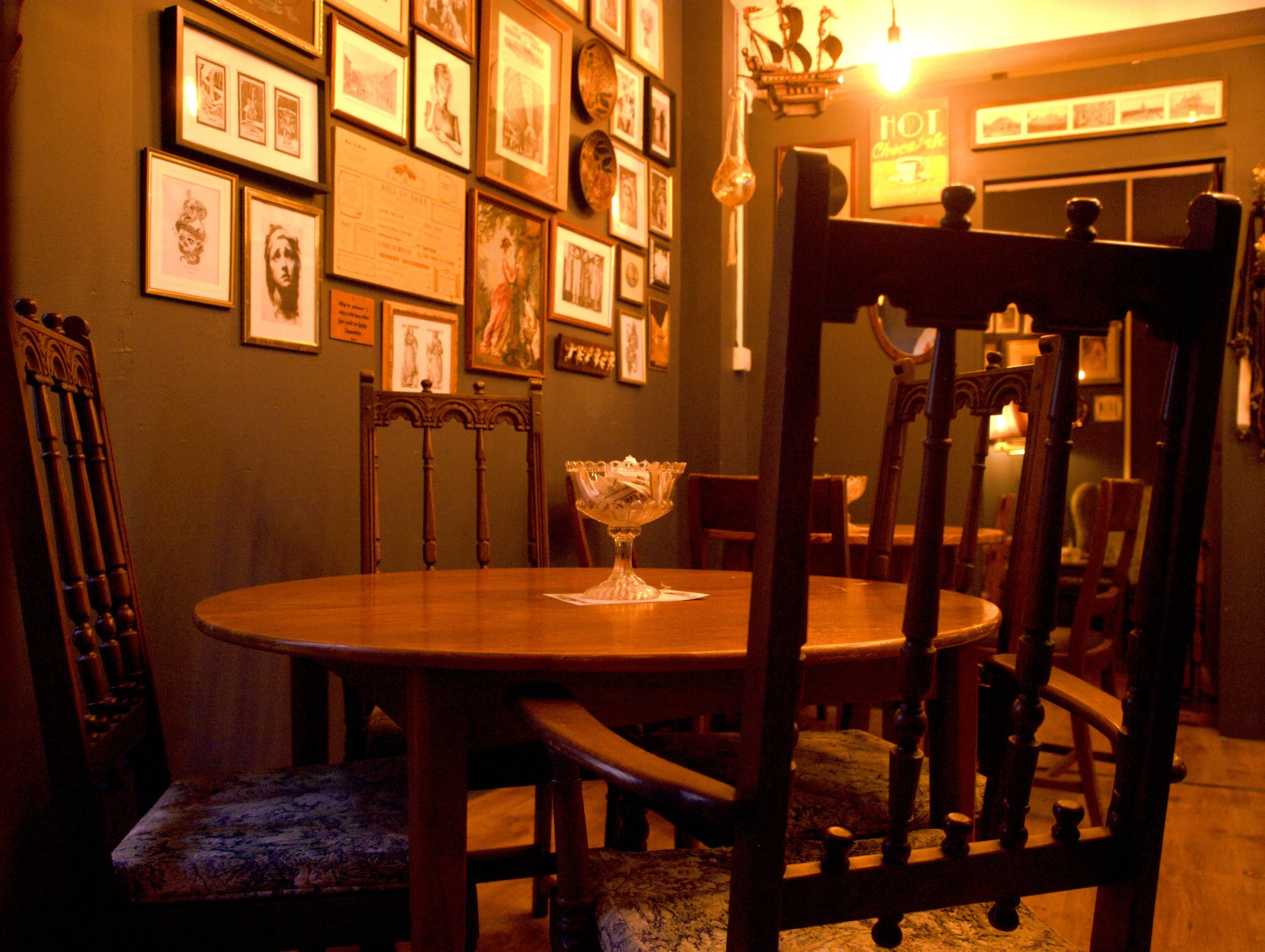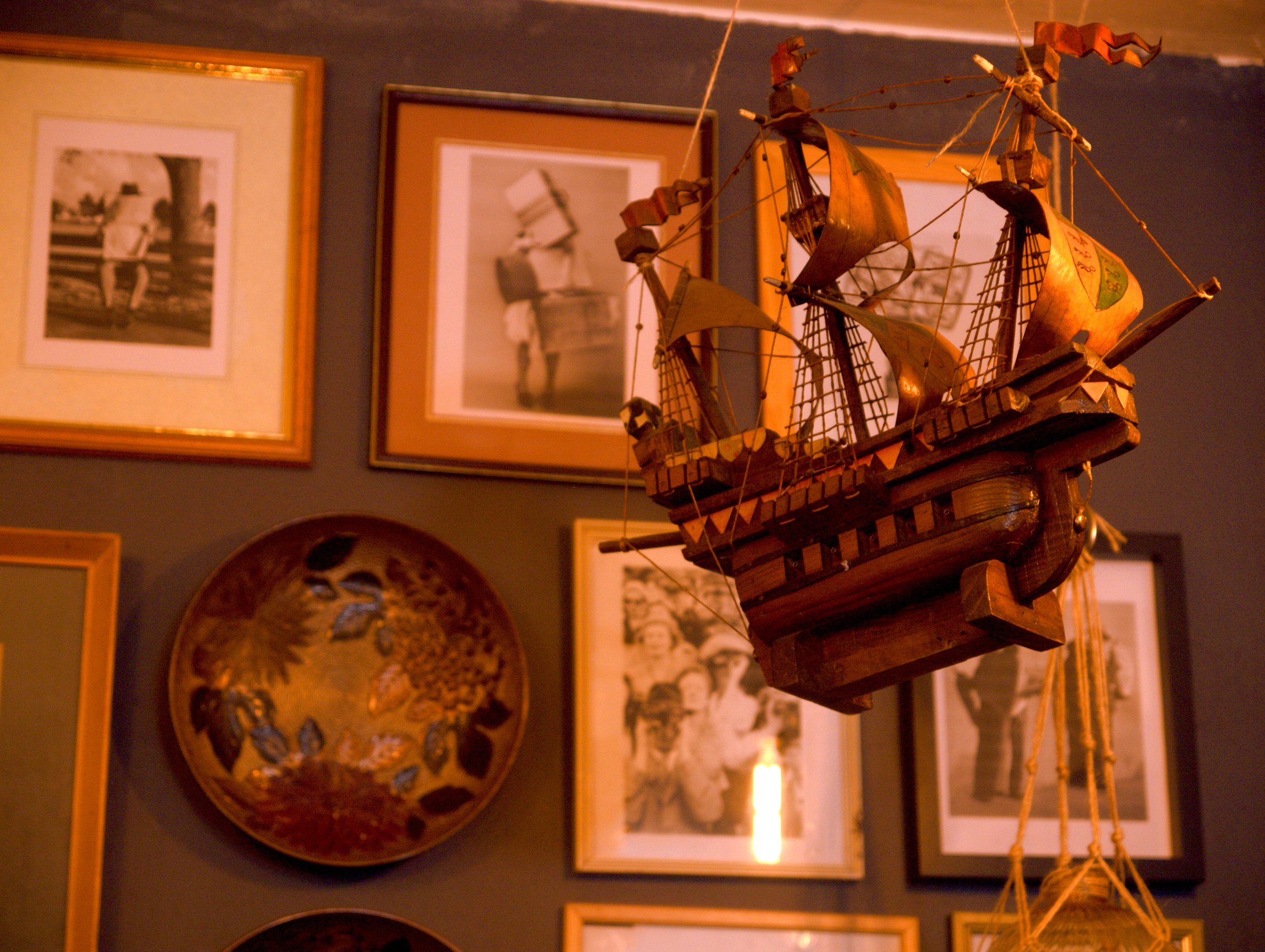 • Decorative clock with Roman numerals on a dark wall surrounded by framed artwork and antique items.
