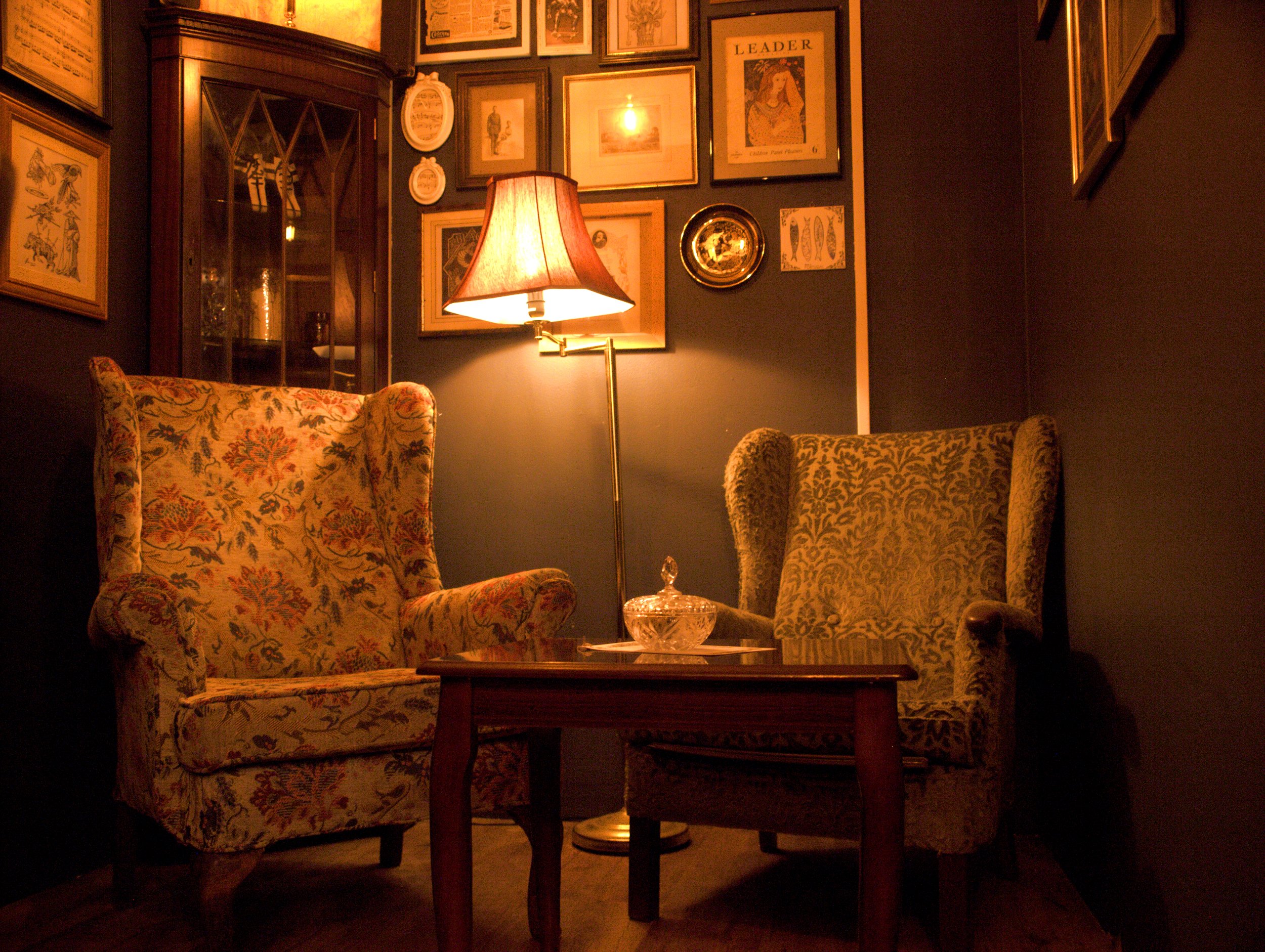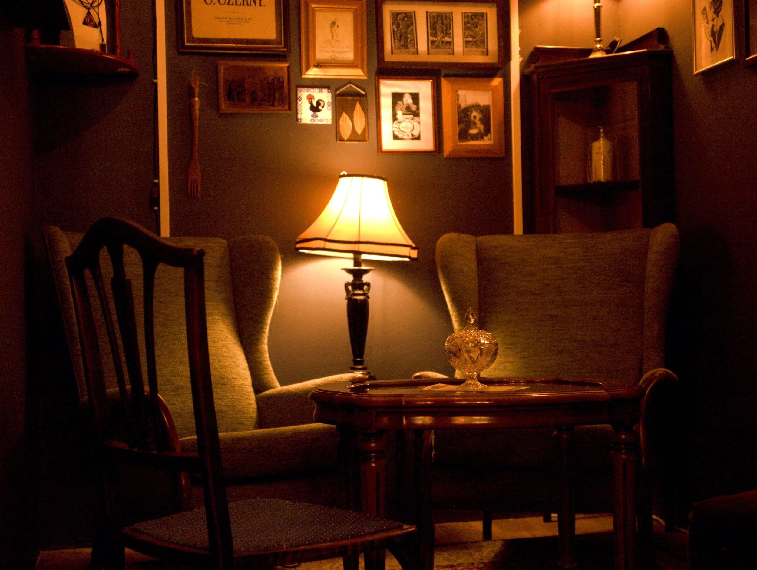 • A wall decorated with multiple framed pictures and artwork, arranged in a gallery style, with warm lighting creating a cozy atmosphere.