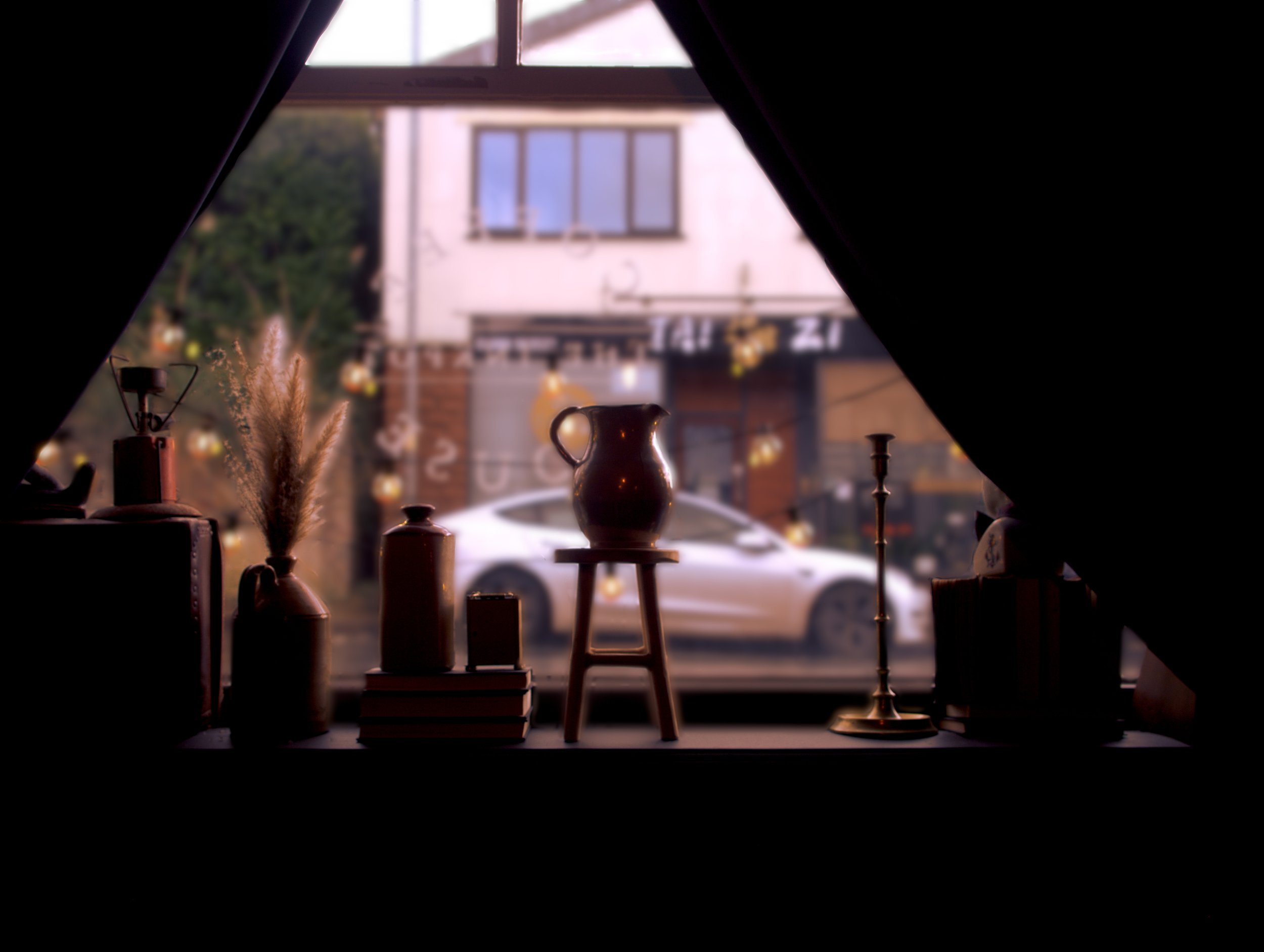 • A glass cake stand with a dome lid containing a chocolate cake, set on a wooden surface. In the background, a purple neon sign shaped like a hand making the 'rock on' gesture with the number 20 inside the fingers, and a framed document on a dark wall.